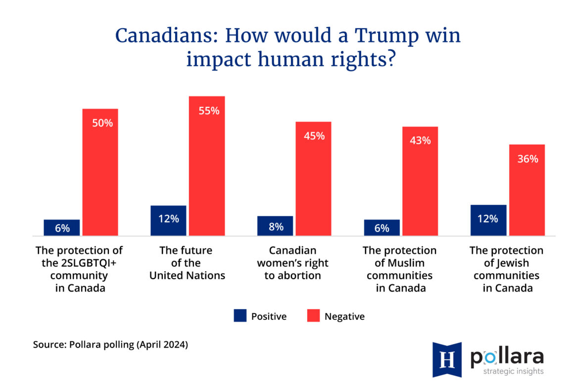 Pessimism also prevails around human rights issues. Fifty-one percent of Canadians feel that if Donald Trump returns to the White House, this would have a negative impact on the protection of LGBTQ rights in Canada and 45 percent think it would jeopardize the protection of the reproductive rights of Canadian women. Moreover, a plurality of Canadians also fear Trump would have a negative impact on the protection of Muslim communities in Canada (43 percent). Thirty-six percent of Canadians believe he’d have a negative impact on the protection of Jewish Canadians.